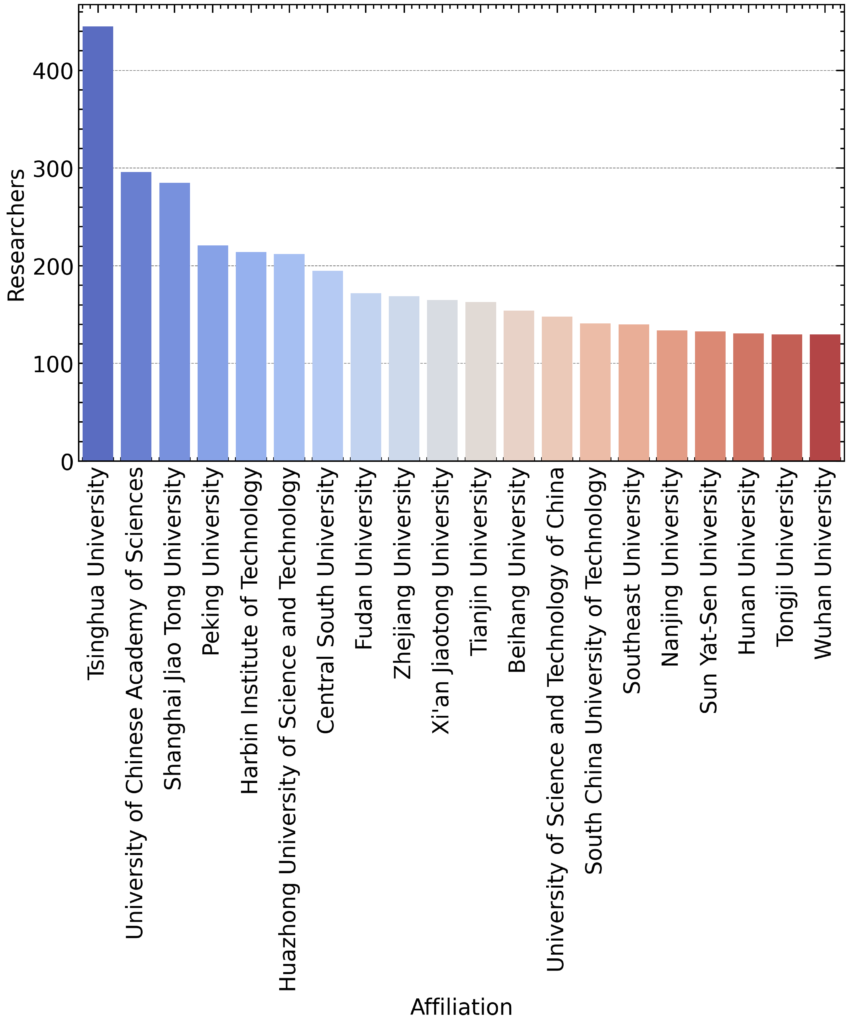 - Elite institutions such as Peking University (221), Harbin Institute of Technology (214), and Huazhong University of Science and Technology (212) also contribute significantly.