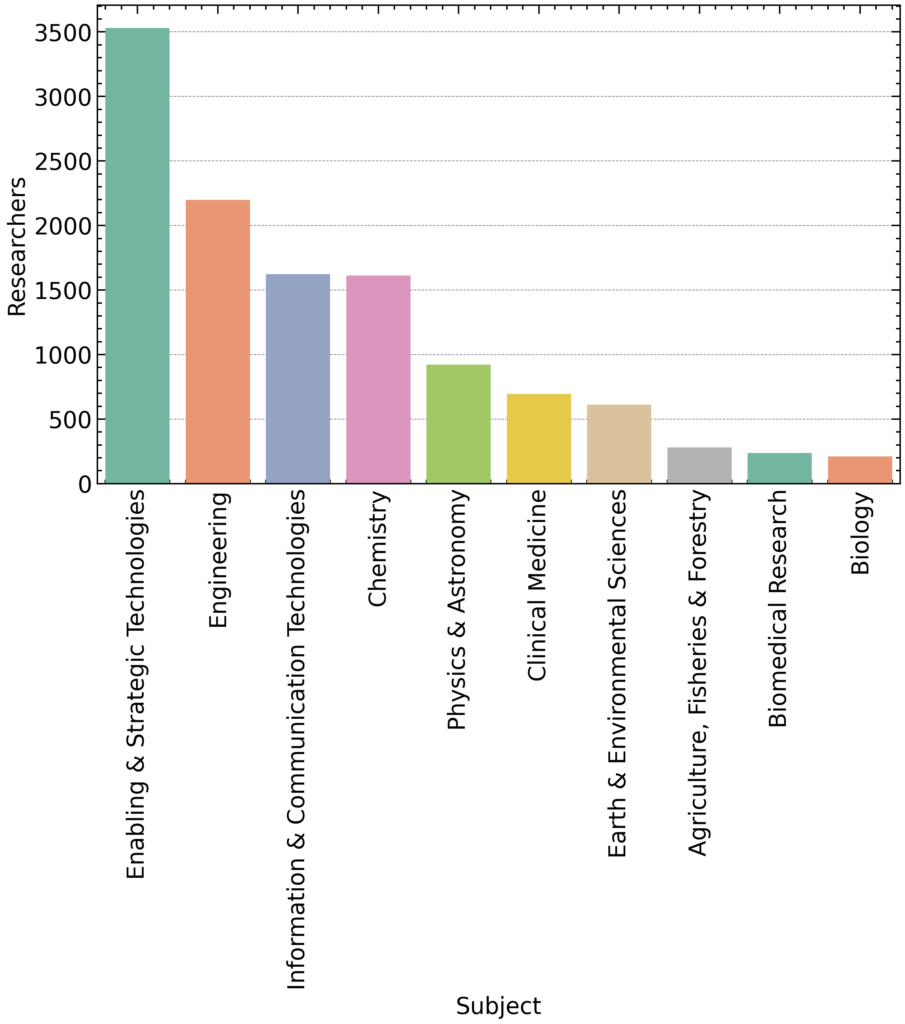 - Enabling & Strategic Technologies (3531 researchers) dominate, reflecting China’s national focus on AI, quantum computing, semiconductors, and defense-linked technologies.