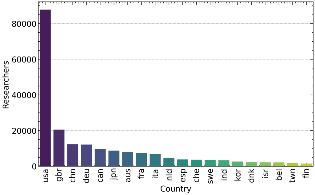 The first figure illustrates the distribution of top scientists by country. The United States overwhelmingly dominates the list, with nearly 90,000 researchers, far surpassing other nations. The United Kingdom and China follow, contributing approximately 20,000 and 12,000 researchers, respectively. Other strong contributors include Germany, Canada, Japan, Australia, France, and Italy.