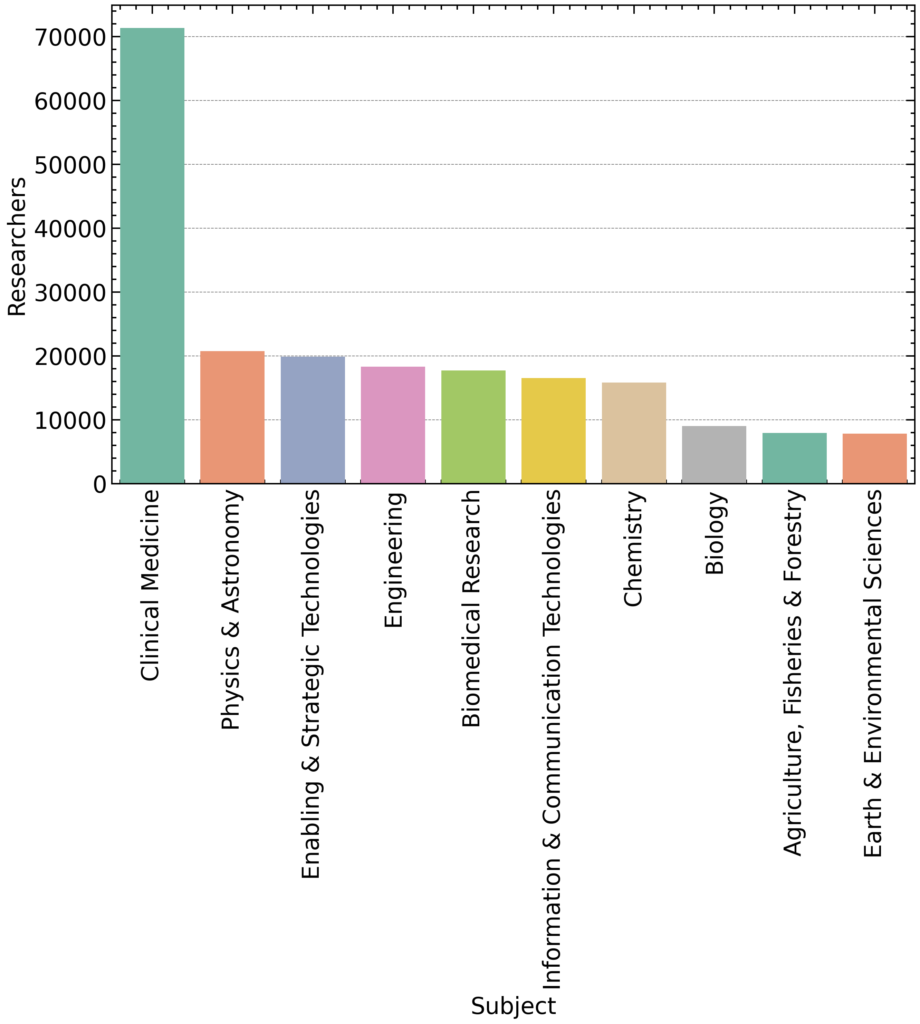The second figure shows the subject-wise distribution of researchers. Unsurprisingly, Clinical Medicine dominates with nearly 70,000 scientists, reflecting the vast research output in health and medical sciences.
