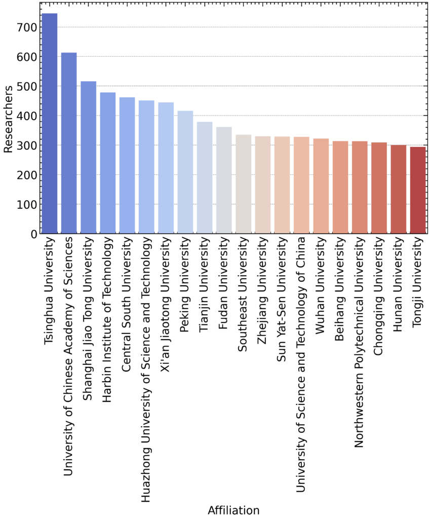 • Tsinghua University (746 researchers) leads the list, reinforcing its position as China’s flagship in science, engineering, and technology.