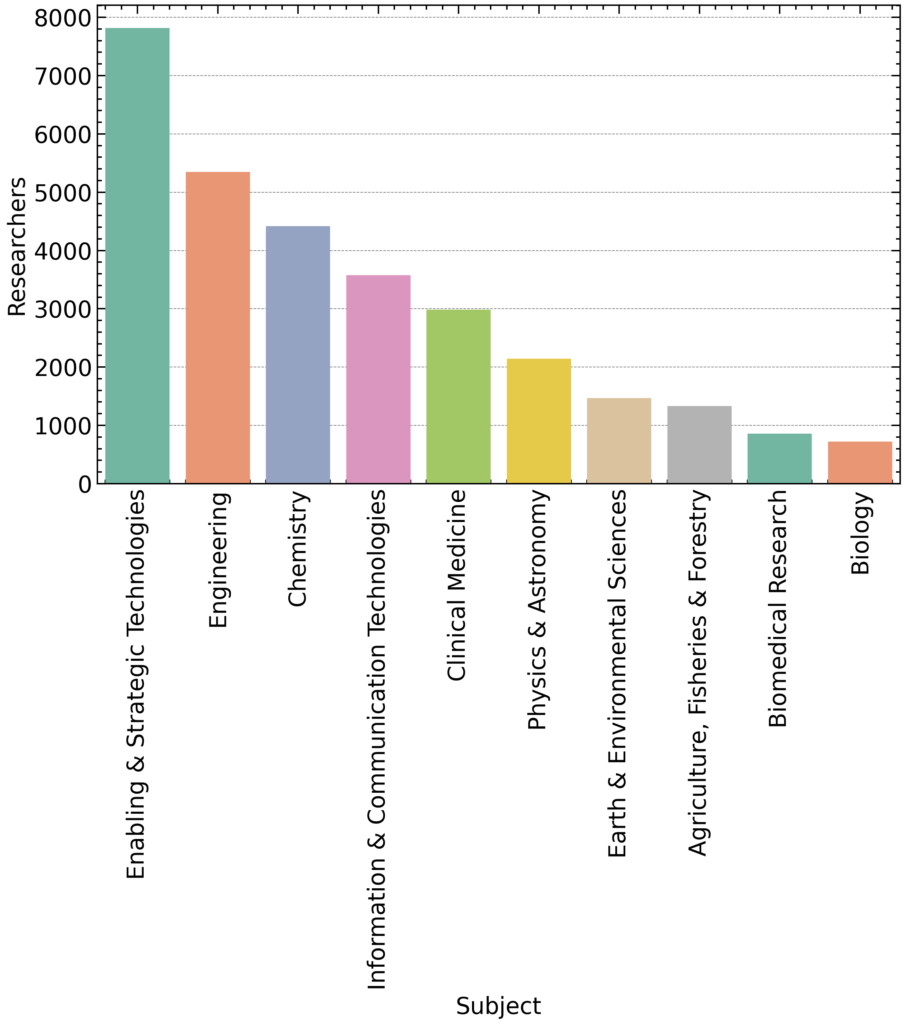 • Engineering (5345) and Chemistry (4420) highlight industrial innovation and chemical sciences as central pillars of research.