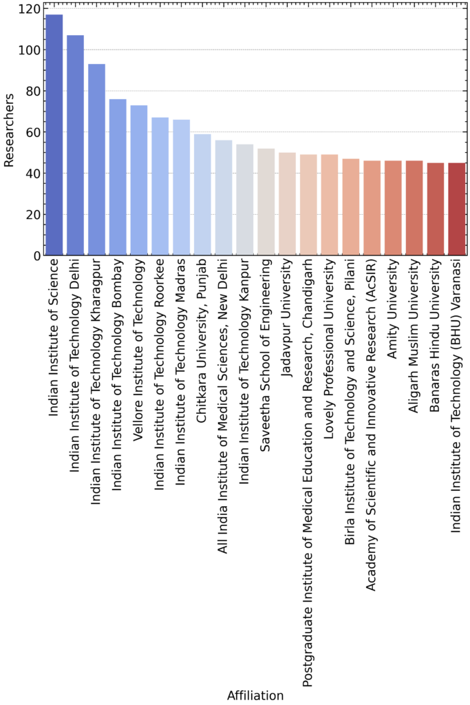 Interestingly, private institutions such as Vellore Institute of Technology (73), Chitkara University (59), and Lovely Professional University (49) also feature prominently, reflecting the increasing research output beyond central institutes. Prestigious medical and multidisciplinary institutions like AIIMS New Delhi (56), PGIMER Chandigarh (49), and Banaras Hindu University (45) also make strong contributions.