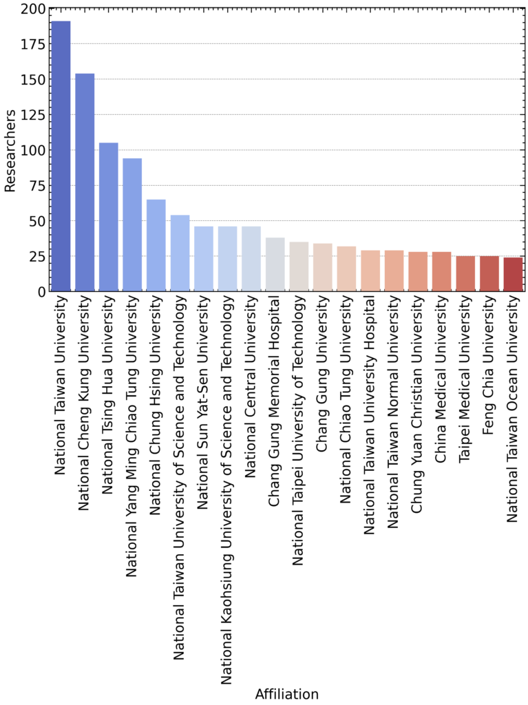 - National Taiwan University (NTU) leads with nearly 190 researchers, confirming its role as Taiwan’s premier research hub.
