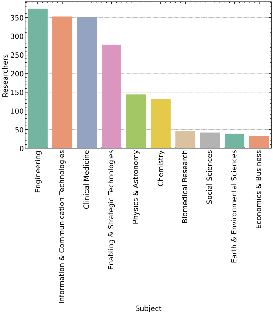 - Engineering overwhelmingly dominates with over 374 researchers.