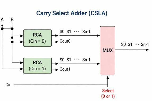 Figure 4: Carry Select Adder where it calculates two results at the same time and selects the correct one.