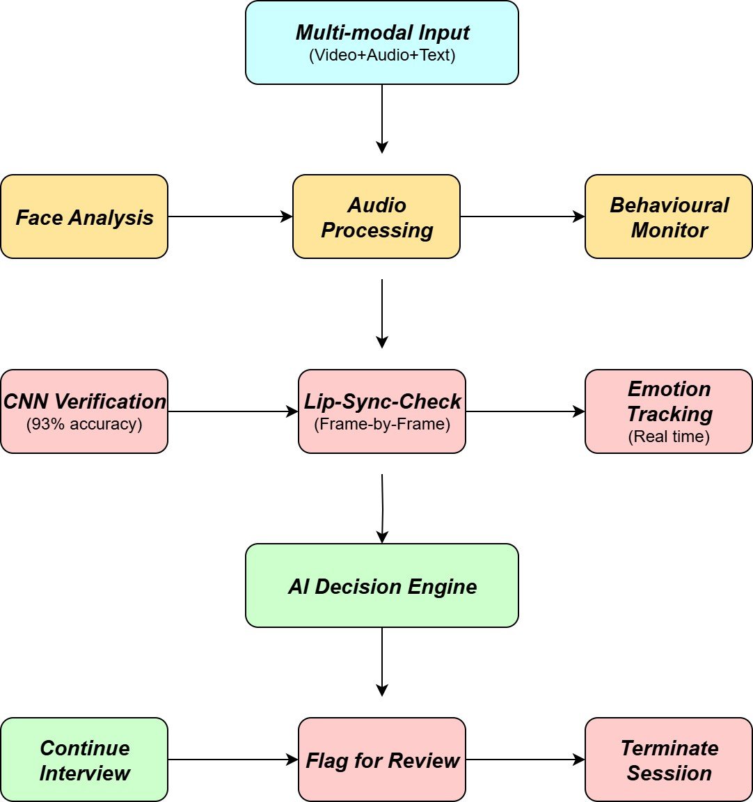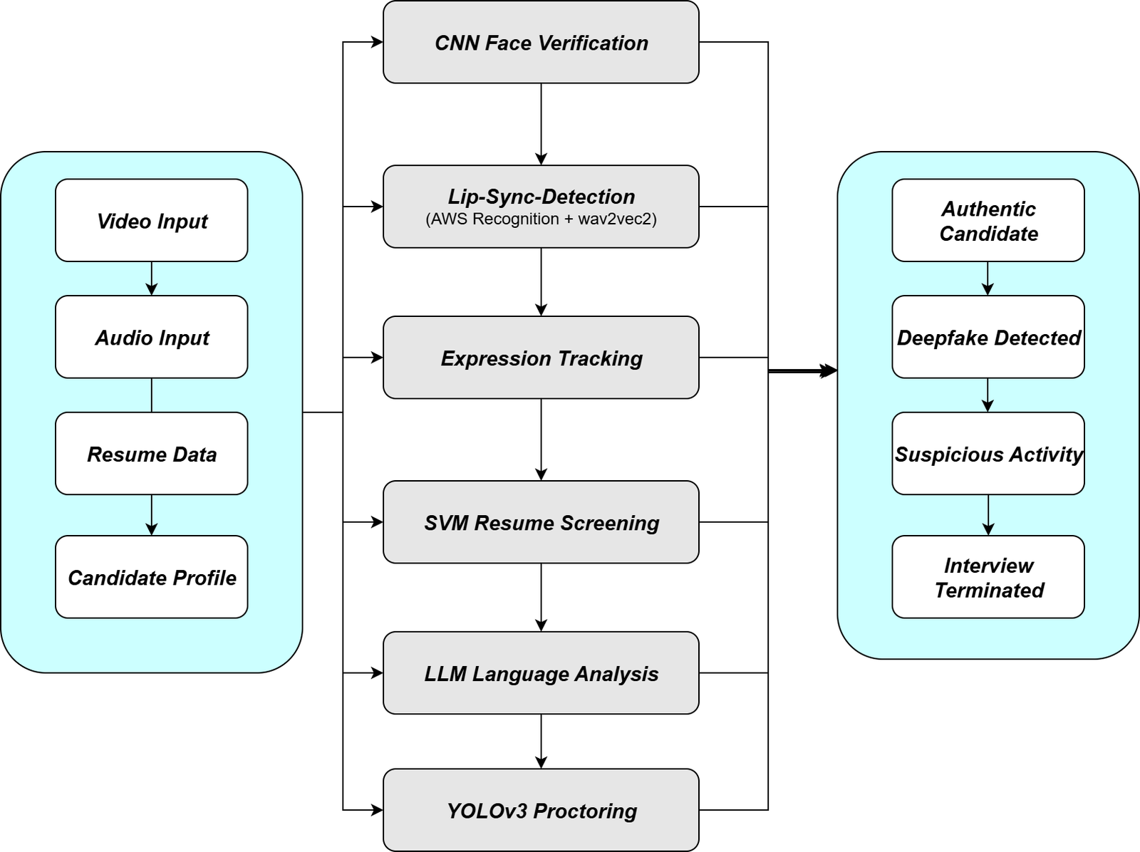 The Deepfake technology has been a huge threat to recruitment and corporate security due to the allowance of job application and CEO fraud. The proposed technique shows that not only is the improvement of AI in hiring efficiency be enough, but it must also improve in defense. The models, such as ML, CNN, audio-video synchronization, and emotion tracking systems, will be used to sup- port the candidate assessment and will help detect deepfakes. The mechanisms such as the proctoring systems, and AI-driven chatbots, helps to increase the engagement and reliability of the interview process. To protect the digital hiring process, a comprehensive integration of assessment, verification, and monitoring is needed, which will ensure the authenticity and reduce the danger of AI-driven assaults.
