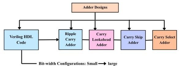 The very first stage requires designing of the digital adder architectures by using Verilog HDL (Hardware Description Language). In recently developed VLSI systems, the Register Transistor Level (RTL) design creates the base for the performance calculation which is commonly used for early-stage research [2]. Each digital adder is being implemented for multiple bit-widths in order to provide scalability and variance in the dataset. The hardware design flow using Verilog HDL is illustrated in Fig. 1.