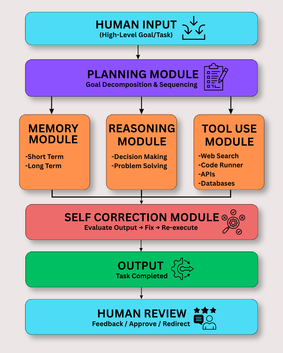 - Self-Correction: If something goes wrong at one stage, the system does not stop and moves forward. It reassesses its actions and finds ways to continue approaching the goal [3].