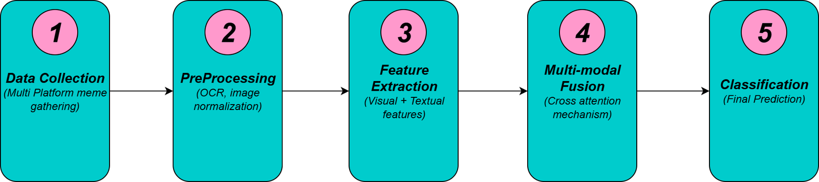 To study the combination of meme culture, satirical deepfakes, and their potential to harm others, a multimodal methodology is proposed to detect the offensive meme content as follows [1]. The complete processing workflow pipeline is provided in Figure 1 below: