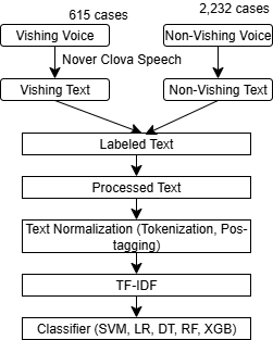 In addition to the full dataset, we created a smaller dataset by excluding cases with more than 5000 words, called the Top-5000 dataset, to address the imbalance in the length distributions between vishing and nonvishing cases. Each word was then tagged by dividing each text into morpheme units. We used open Korean text (OKT) from Korean natural language processing in Python (KoNLPy), and Khaiii (Kakao hangul analyzer), which are widely applied in the Korean NLP process. The nouns, adjectives, and verbs that remained were employed in the analysis. They then used the TF-IDF vectorizer for feature extraction. Classification experiments were conducted after feature extraction. In addition to the features, the paired POS tags for each word were analyzed to better understand the context of the text.