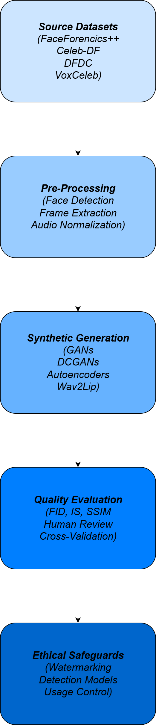 Generating synthetic data has been developed as an essential strategy for dealing with data shortage, imbalance in data, and privacy concerns in using Artificial Intelligence (AI). Deepfake technology will provide an advanced mechanism for creating realistic synthetic audio and video data [4]. The deep-learning architectures such as Generative Adversarial Networks (GANs), Deep Convolutional GANs (DCGANs), and auto-encoders will be used to create good-quality, realistic images, videos, and voice. Deepfakes techniques are effective for training datasets, improve the robustness of the model, and can be applied in computer vision, Natural Language Processing, and multi-modal learning [5]. To increase the accuracy of the generation techniques, the standard metrics such as Fr´echet inception Distance (FID), Inception Score (IS), and Structural Similarity Index (SSIM) are used to increase the realism and consistency. To detect the misuses that are made by these technologies, the detection models have been integrated based on Convolutional Neural Networks (CNN), Recurrent Neural Networks (RNN), and Efficient ensures that the manipulated data is used responsibly and the detection mechanism can be able to find the differences between the real and deepfake information [2][3]. In this article, we will go through the methodology for creating and evaluating synthetic datasets with deepfake technologies, which provides both the technical performance and precautions to enable the security for the applications of AI.