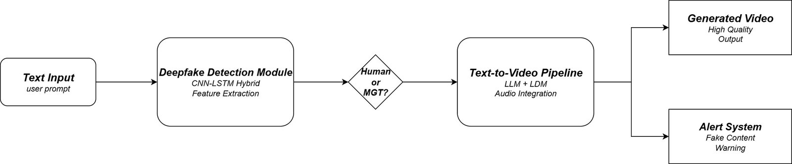 The quick development of Artificial Intelligence (AI) has enabled the technology to create highly realistic media by using text-to-video synthesis [4]. This technology uses advanced generative models to make the text into visual con- tent. This advanced technology of creating realistic text-to-visual content poses crucial threats, such as the generation of realistic deepfake media and spreading misinformation about someone by generating fake content regarding the particular individual or groups [5]. To overcome these threats, this study introduces a two-part framework for deep-fake text identification and video production. For text-to-video generation, the pipeline uses a large language model (LLM) and uses the Latent Diffusion Model (LDM) to generate the videos from the texts [4]. The other part is a robust detection model, which is used to detect the machine-generated Text (MGT) [1][5]. In this article, we will go through the creation of a Hybrid deep learning architecture, which will create the videos and detect Machine-generated Text (MGT). The complete overall system architecture has been shown in Figure 1 below: