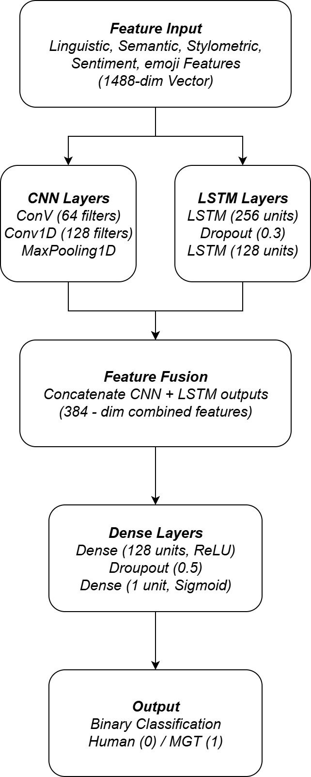 A hybrid deep learning framework, which is a combination of a convolutional neural network (CNN) and long-Short-term memory (LSTM), will be used for classification purposes [1]. The CNN will be used to extract the local n-gram- like characters from the text data, where the LSTM will be used to capture the temporal and sequential relationships between the texts. The combination of these 2 frameworks will enable the model to use both the local and long-range contextual information, which will increase the accuracy and robustness of the detection system.