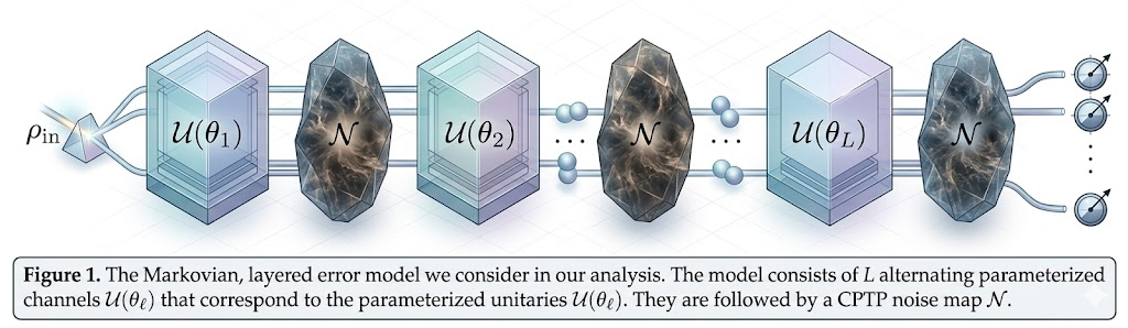 Figure 1: Markovian layered error model showing L alternating parameterized unitary channels U(θℓ) interleaved with CPTP noise maps N, illustrating how repeated noise applications drive the quantum state toward a fixed point and erase historical parameter dependence. (generated using AI Tools)