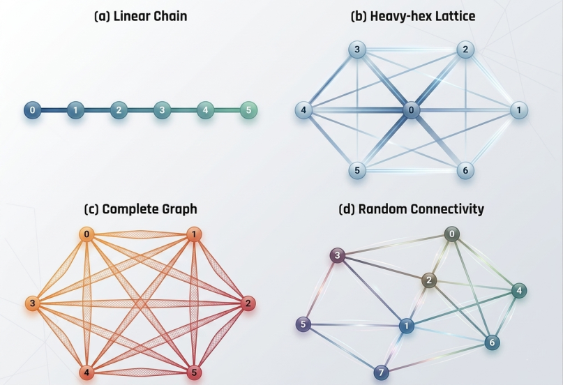 Figure 2: Four representative quantum hardware connectivity topologies — (a) Linear Chain, (b) Heavy-hex Lattice, (c) Complete Graph, and (d) Random Connectivity — illustrating how architectural structure influences noise propagation and the rate of coherence loss. (generated using AI Tools)