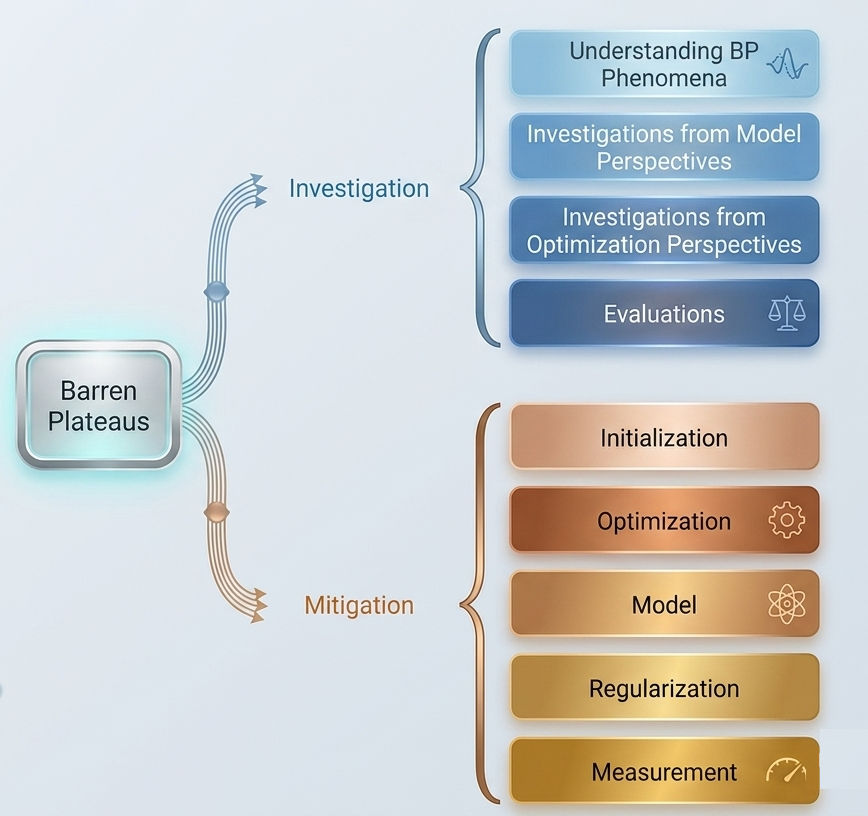 Figure 3: Hierarchical taxonomy of barren plateau (BP) research, branching into investigation approaches (model and optimization perspectives, evaluations) and mitigation strategies (initialization, optimization, model design, regularization, and measurement).
