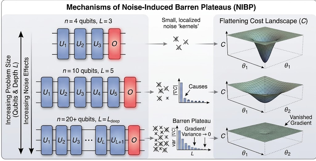 Figure 4 : Mechanisms of Noise-Induced Barren Plateaus (NIBPs) across increasing problem sizes: as circuit depth L and qubit count n grow, localized noise kernels accumulate, causing gradient variance to vanish and the cost landscape C to flatten completely.