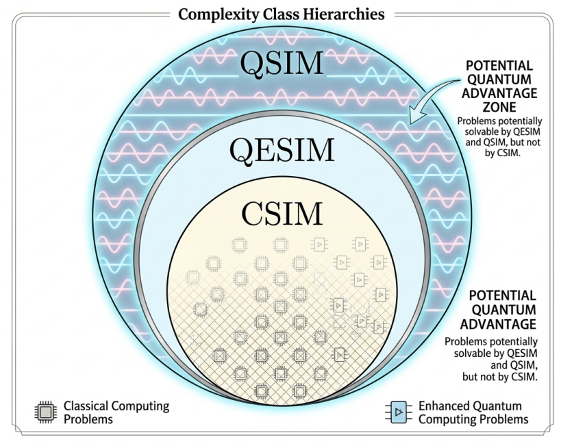 Figure 6: Complexity class hierarchy illustrating the relationship between classical simulation (CSIM), quantum-enhanced simulation (QESIM), and full quantum simulation (QSIM), highlighting the two potential quantum advantage zones where QSIM or QESIM outperform classical methods.