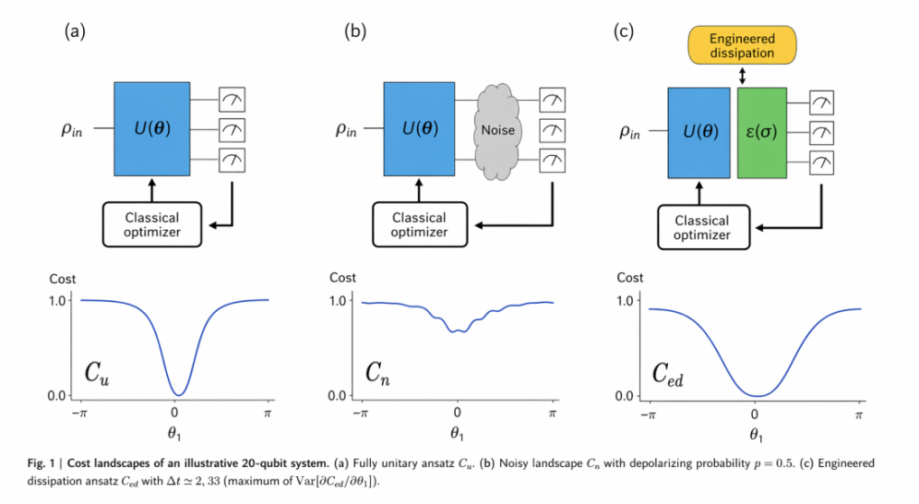 Figure 7: Comparison of three variational quantum algorithm (VQA) paradigms and their cost landscapes: (a) ideal unitary circuit C_u, (b) circuit with generic noise C_n causing barren plateaus, and (c) circuit with engineered dissipation ε(σ) producing C_ed — restoring a trainable, well-defined cost landscape.